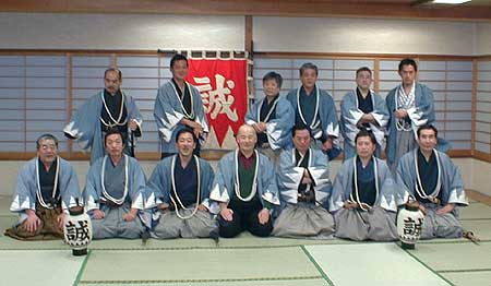 壬生寺近藤勇胸像前に整列。左から大石、井上、武田、島田、永倉、藤堂、沖田、斎藤、近藤、土方の各隊士。