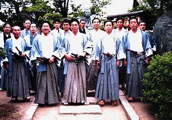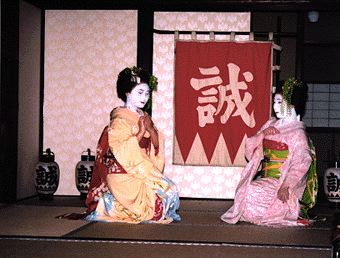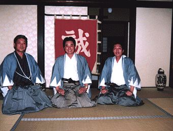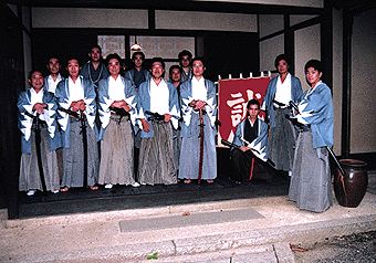 京都新選組同好会は平成9年6月15日(日)、午後6時30分より壬生寺正門前の黒竹家にて第20回池田屋事変記念パレード打ち合わせのため参集した。 会合に先立ち、隊士は壬生塚にある近藤先生の像及び新選組隊士の墓に参詣した。 パレード打ち合わせでは例年通りに7月16日(水)午後4時より壬生寺を出発する事が決議された。 11月に実施予定の長州遠征についての準備状況が報告された。 また、新入隊希望の二名が紹介され、全員一致で承認された。 打ち合わせの後、宮川町「桜家」さんから小糸さん、晴代さん、美代乃さんを招き、華やかな宴を開いた。 |